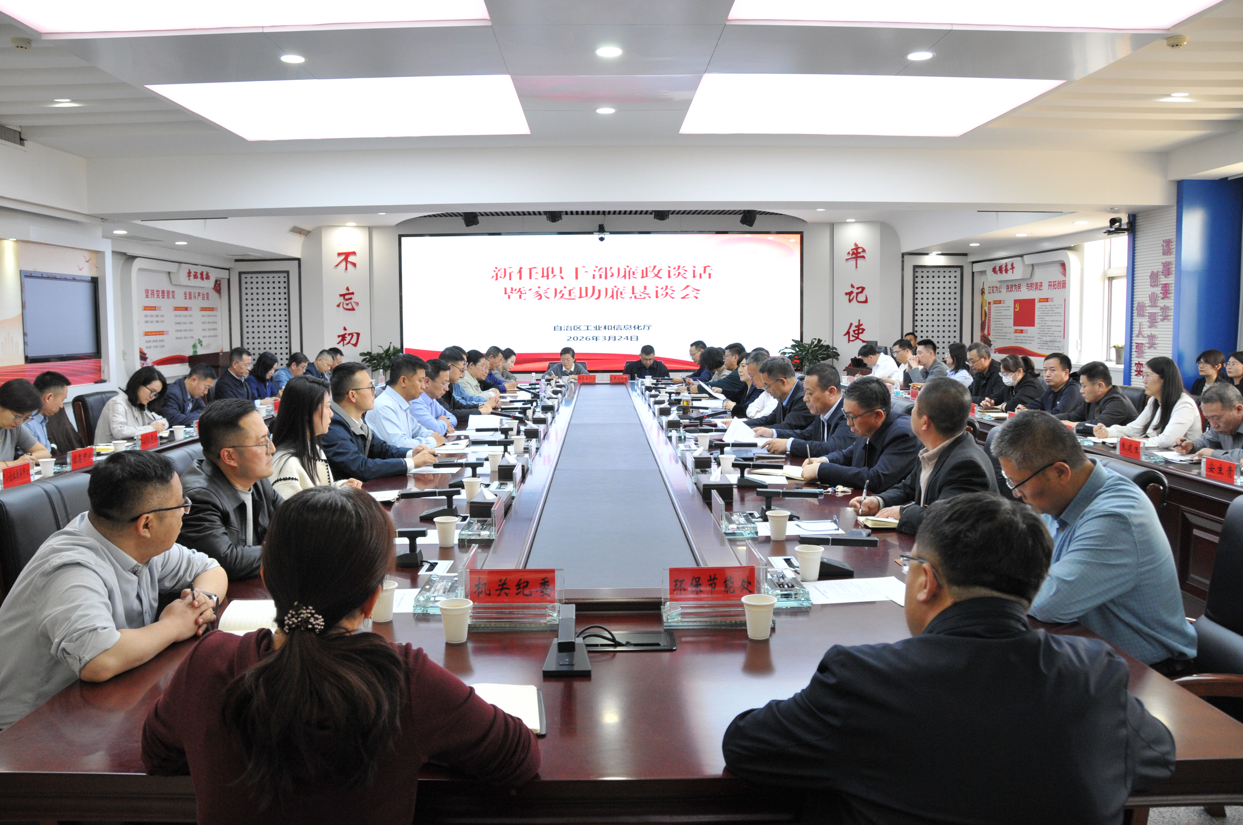 为扎实开展树立和践行正确政绩观学习教育,推动“廉政警示教育周”活动走深走实,3月24日,自治区工业和信息化厅党组会同派驻纪检监察组召开新任职干部廉政谈话暨家庭助廉恳谈会。厅党组成员、驻厅纪检监察组组长路东海同志主持会议并作廉政谈话,厅党组书记、厅长杨金海同志出席会议并作集体谈话。厅领导、各党支部书记、新任职入职干部、家属代表,共计70余人参加会议。