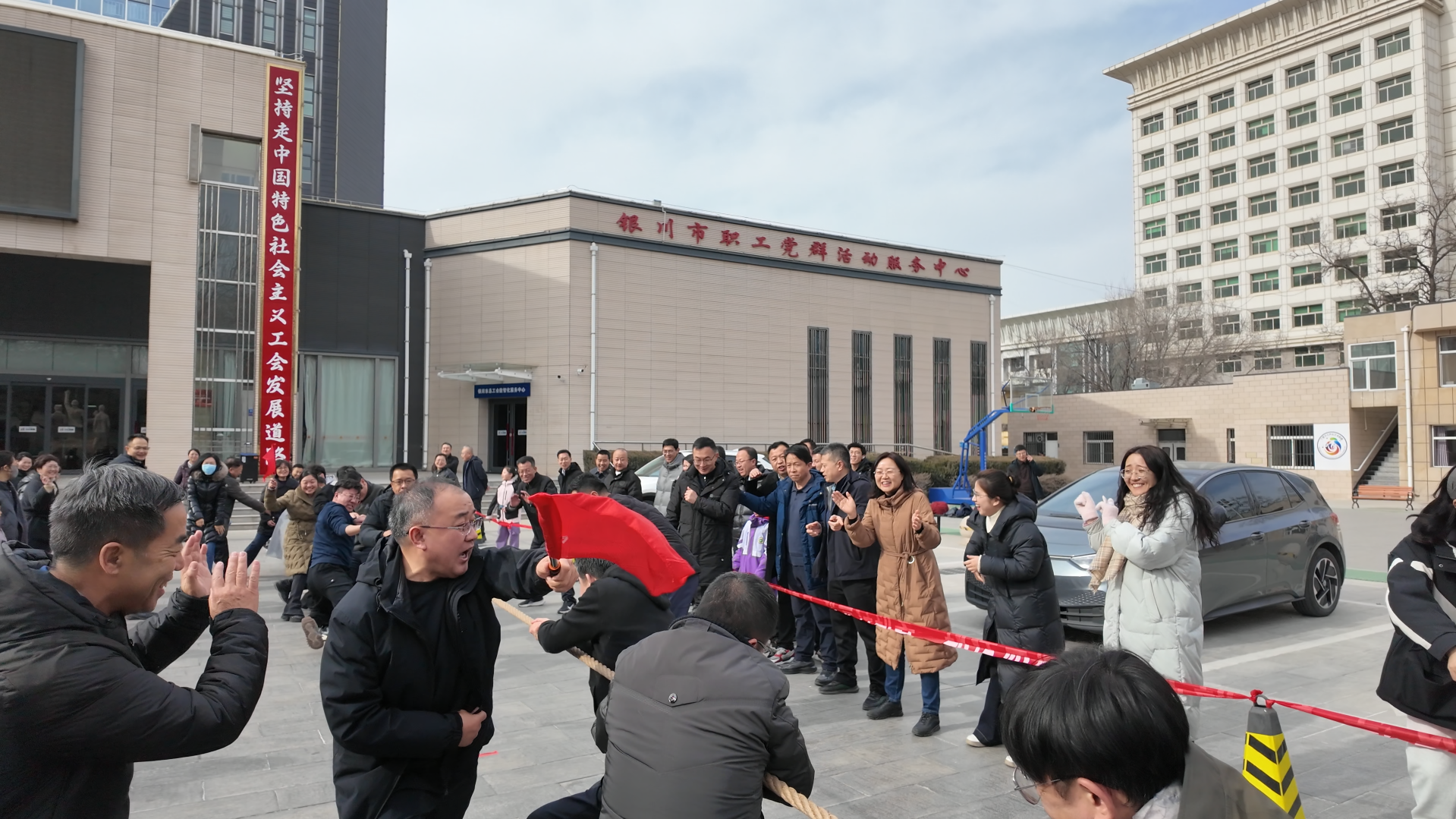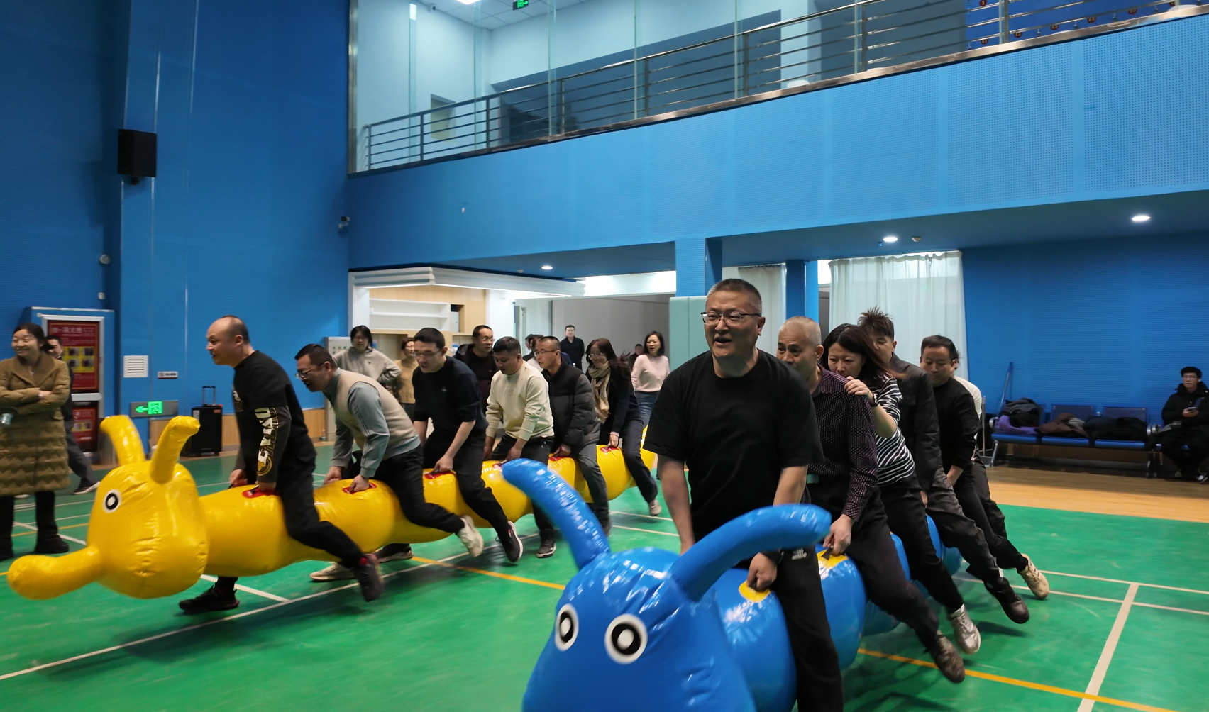 赛事妙趣高潮迭,欢声笑语满堂彩。趣味运动会上精心设置了“同心鼓劲”拔河赛、“冲锋向前”接力跑、“精准投送”抛绣球、“龙腾虎跃”袋鼠跳接力等多个集趣味性、协作性于一体的团队项目。“拔河比赛”势均力敌,绳索中心的标记来回拉锯,彰显力量与意志的较量,赛场上加油声、呐喊声、欢呼声此起彼伏,不绝于耳;“冲锋向前”起跑线上身影如箭,全力冲刺的速度感点燃全场激情;“螃蟹慢行”背靠背、臂挽臂,横向移动中展现配合的巧劲与平衡的智慧;“袋鼠跳”双脚束袋、跃动前行,笨拙又可爱的姿态引发阵阵欢笑。整个赛场始终沉浸在紧张激烈又活泼和谐的氛围中,掌声与笑声汇成一片,处处洋溢着喜庆祥和的节日气息。