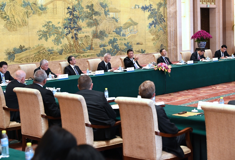 6月21日,国家主席习近平在北京钓鱼台国宾馆会见来华出席“全球首席执行官委员会”特别圆桌峰会的知名跨国企业负责人,并同他们座谈交流。新华社记者 丁林 摄