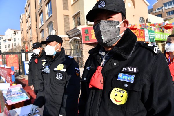 2月10日,贺兰县花园社区奥林匹克花园小区的巡防人员上衣领结处挂着社区为他们发放的中药包,既防护又暖心。
