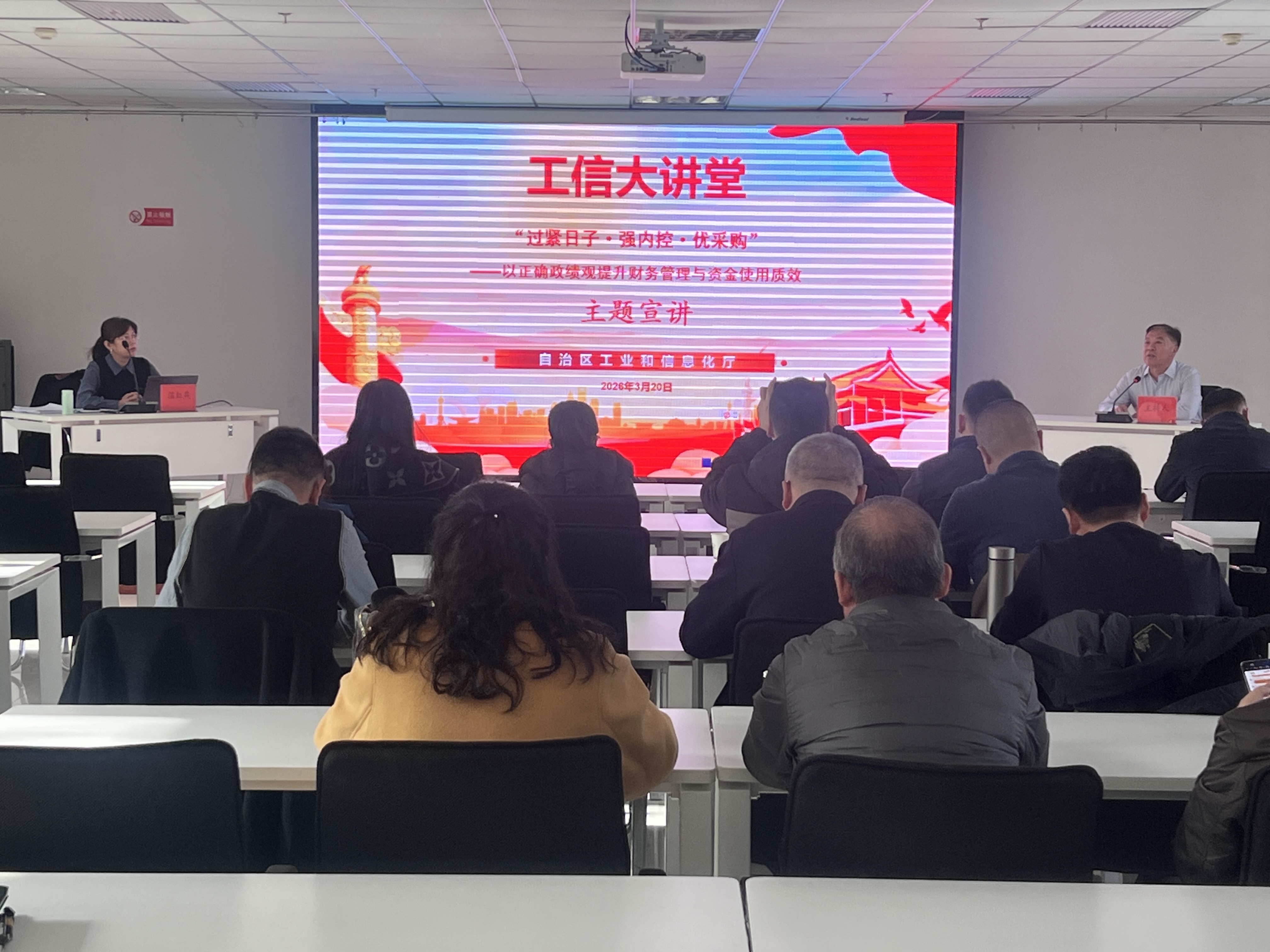 为深入贯彻落实党中央、国务院关于党政机关习惯过紧日子的决策部署,扎实开展树立和践行正确政绩观学习教育,进一步健全财务内控体系、规范政府采购行为、提升资金使用效益、严守财经纪律、筑牢廉政防线,3月20日,自治区工业和信息化厅举办2026年第一期“工信大讲堂”专题学习活动。