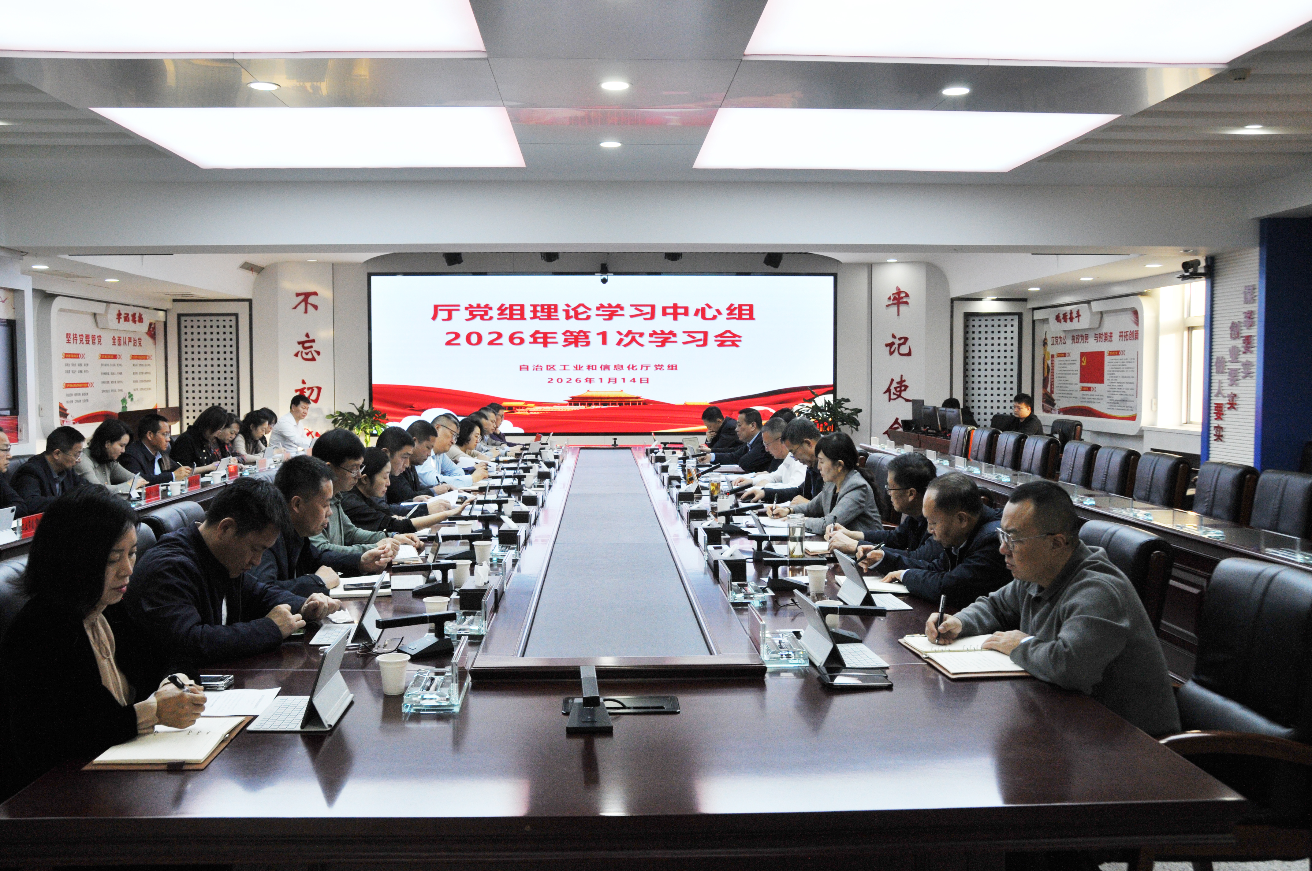 1月14日,自治区工业和信息化厅召开厅党组理论学习中心组学习会,深入学习贯彻习近平总书记重要讲话精神、党的二十届四中全会精神和习近平总书记关于党的建设的重要思想、关于党的自我革命的重要思想以及关于加强党的纪律建设、作风建设的重要论述、考察宁夏重要讲话精神,聚焦2025年度民主生活会规定学习内容,切实做到将中央八项规定精神内化于心、外化于行,为高质量开好年度班子民主生活会打下坚实的思想基础。厅党组书记、厅长杨金海主持会议并讲话,厅党组成员联系工作实际作了交流研讨。各级巡视员和各处室、事业单位负责同志参加了会议。